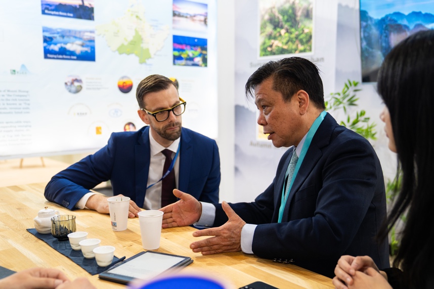 图片说明:黄山旅游发展股份有限公司董事长章德辉(右)和柏林国际旅游交易会中国业务负责人尼古拉斯·斯沃赫在展台上会谈。