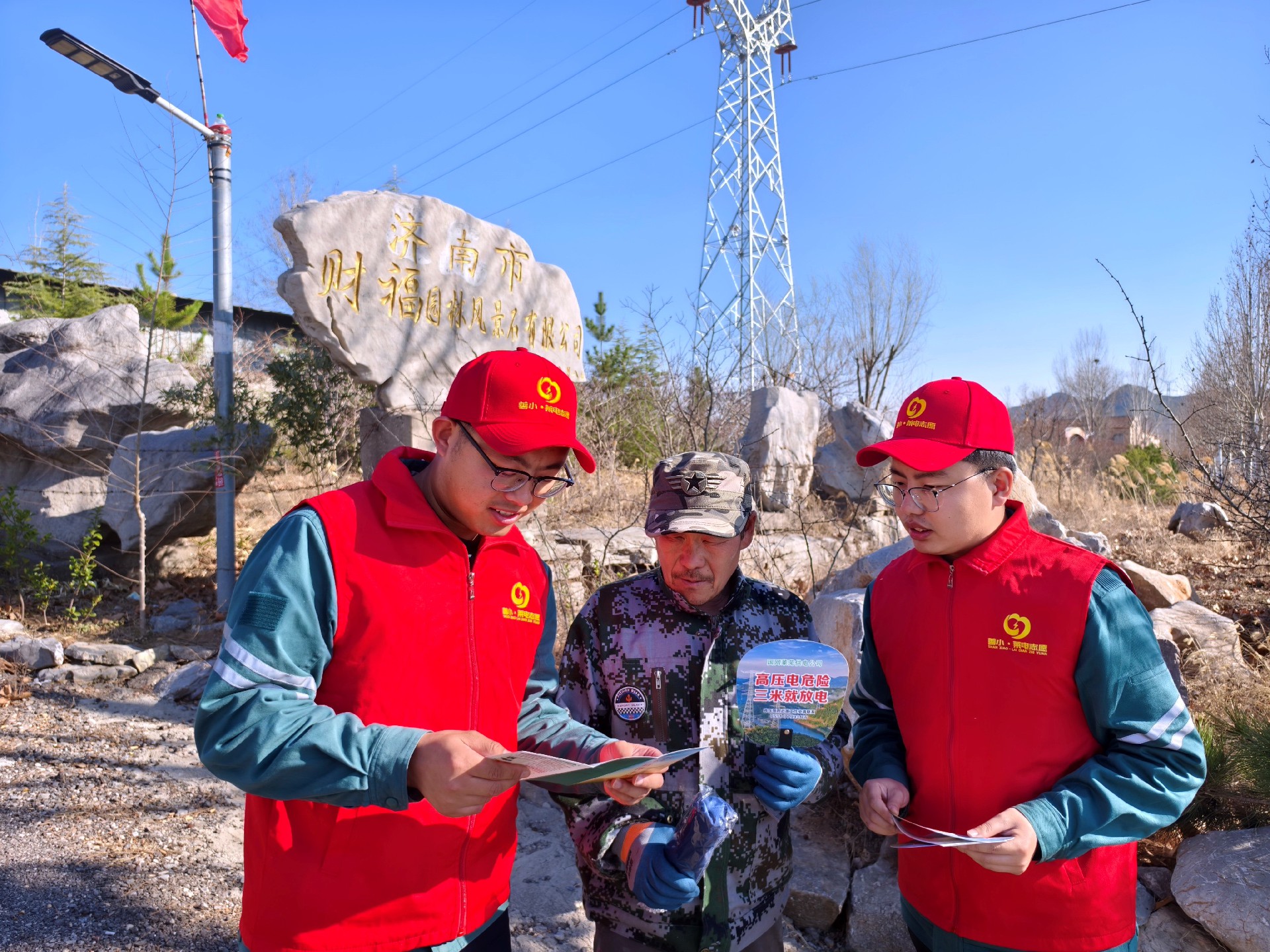 国网山东电力员工在园林景区向种植户介绍植树安全注意事项