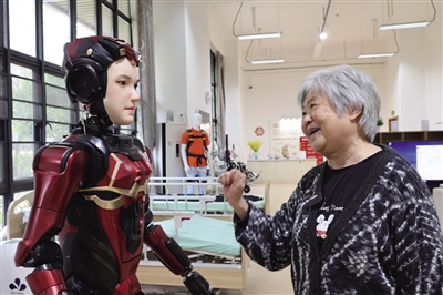在深圳市养老护理院,一名老人与人形机器人“夏澜”互动