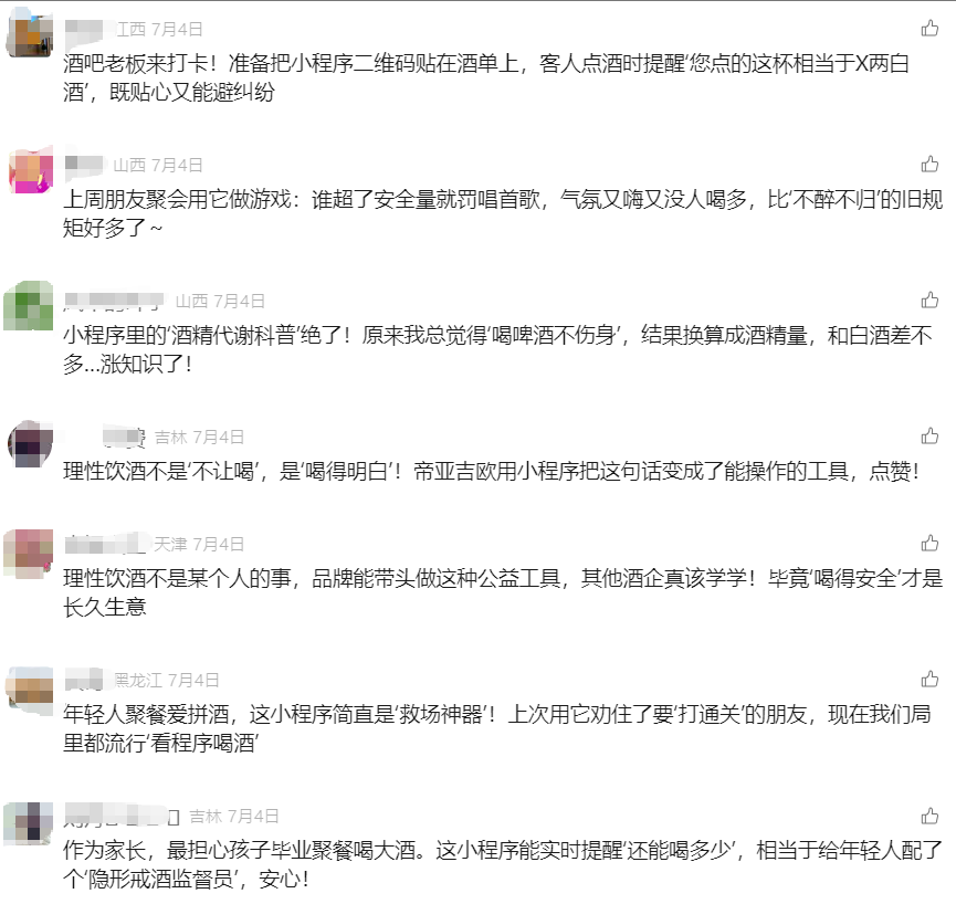 “理性饮酒不是‘不让喝”,是‘喝得明白’”“年轻人聚餐爱拼酒,这小程序简直是‘救场神器’!”……这款帝亚吉欧专为中国市场定制的微信小程序一经上线,便吸引了消费者的广泛参与和热议。