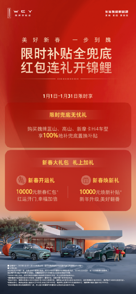 为切实解决消费者之忧,魏牌特别推出“美好生活 一步到‘魏’——限时补贴全兜底,红包连礼开锦鲤”钜惠福利。1月1日-1月31日,购买魏牌高山MPV立享100%地补兜底置换补贴,至诚福利助力消费者购车无忧!