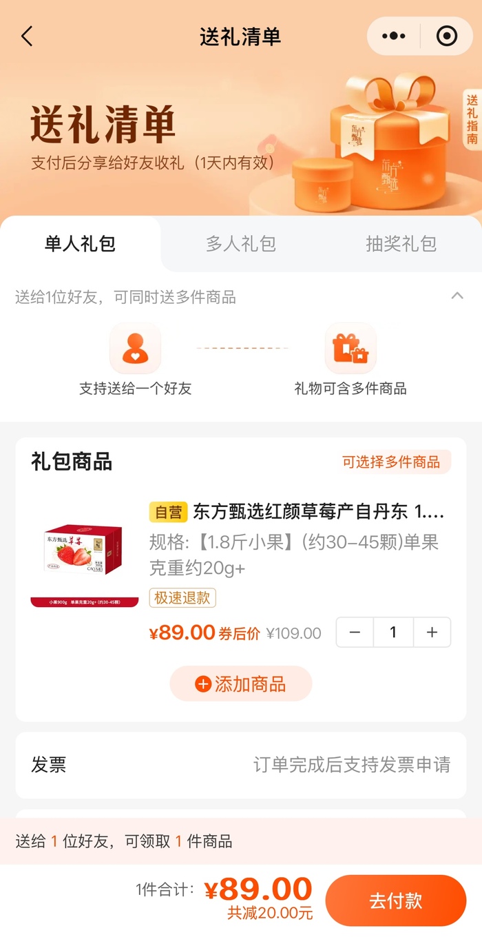 东方甄选相关人士向界面新闻透露,他们非常看重微信小店渠道的增长潜力,会持续加大投入。近期,针对微信小店送礼物场景,公司也专门新组建货盘,增加了一批送礼甄选礼包。