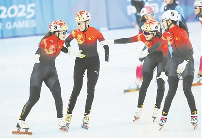 2月9日,第九届亚冬会短道速滑女子3000米接力A组决赛在哈尔滨举行,中国队夺得冠军。