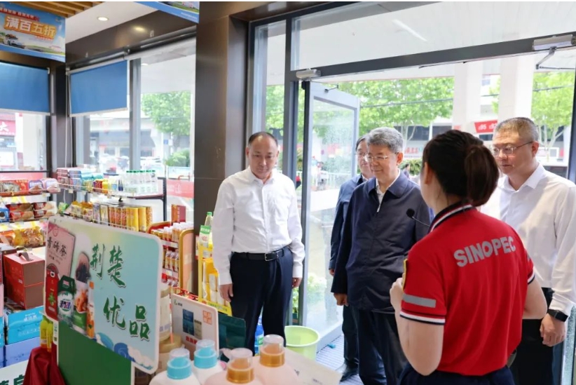 在易捷便利店内的“荆楚优品”特色产品展台前,马永生详细了解江汉盐化工“水杉”牌深井盐等中国石化自有特色商品的销售情况,要求发挥集团一体化优势,将更多中国石化特色商品引入到易捷渠道销售。