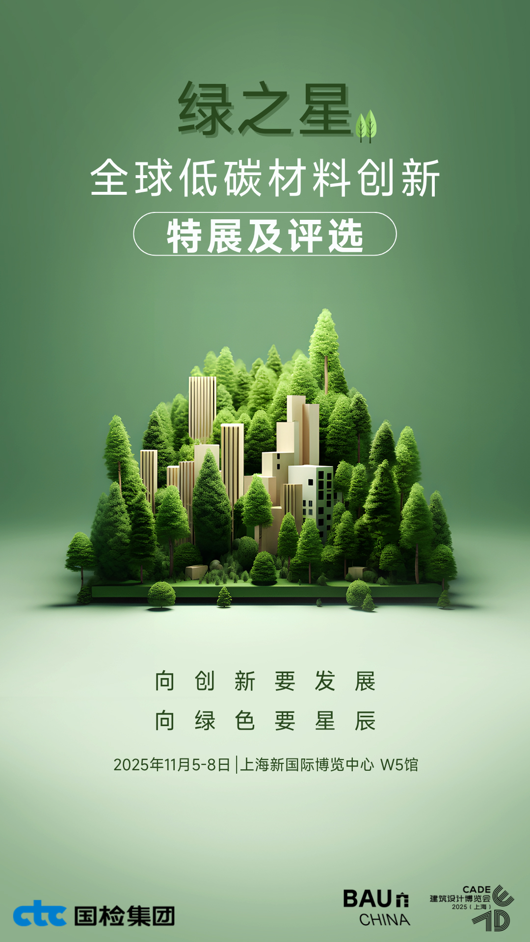 2025年11月5-8日,上海新国际博览中心W5馆,"绿之星·全球低碳材料创新特展及评选"将为中国建材行业点亮破局之路——这里不仅是前沿技术的竞技场,更是绿色革命的宣言台! 绿见未来 BAU CHINA邀请您共做碳路者!