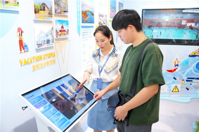 在这里,漫步于半岛之上,游客不仅能够沉醉于湖光山色的宁静美景之中,更能体验到一系列丰富多彩的休闲娱乐活动。旅客轻点落地一体机屏幕,即可解锁“嗨玩半岛”“乐购半岛”“享住半岛”丰富多彩的内容。