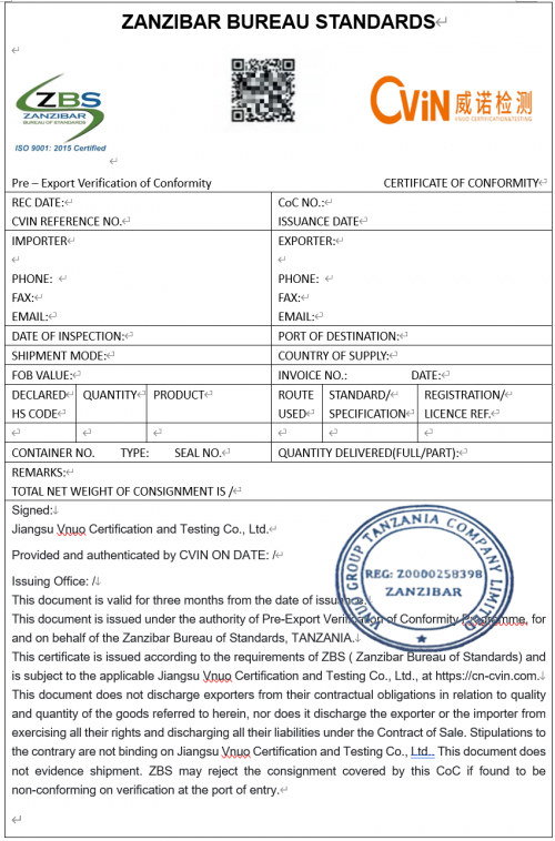 CoC(Certificate of Conformity)符合性证书,是桑给巴尔政府强制要求的清关文件。