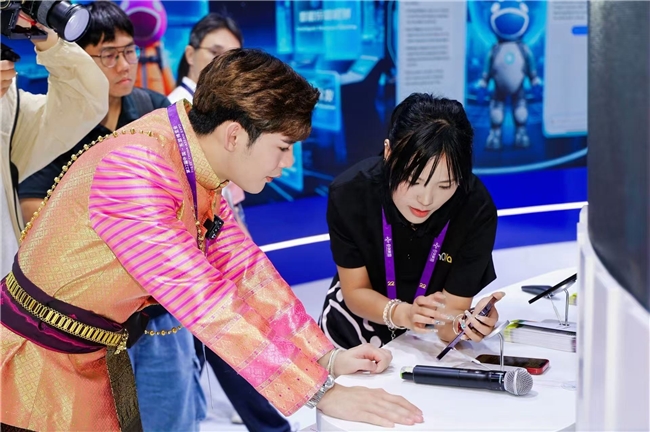 在南宁东盟博览会人工智能专馆,嗯噢哇科技的展台前,一位游客正用泰语与智能助手"旅小哇"交流。"我想看看最具广西特色的景点,"他说道。