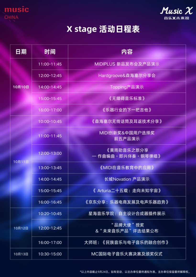 Music X将开设“MusiX Lab音乐科技展区”、“MusiX Life音乐生活展区”、“X舞台”及“MIDI创新区”四个主题区,带给来到现场的观众丰富的视听体验以及音乐享受。